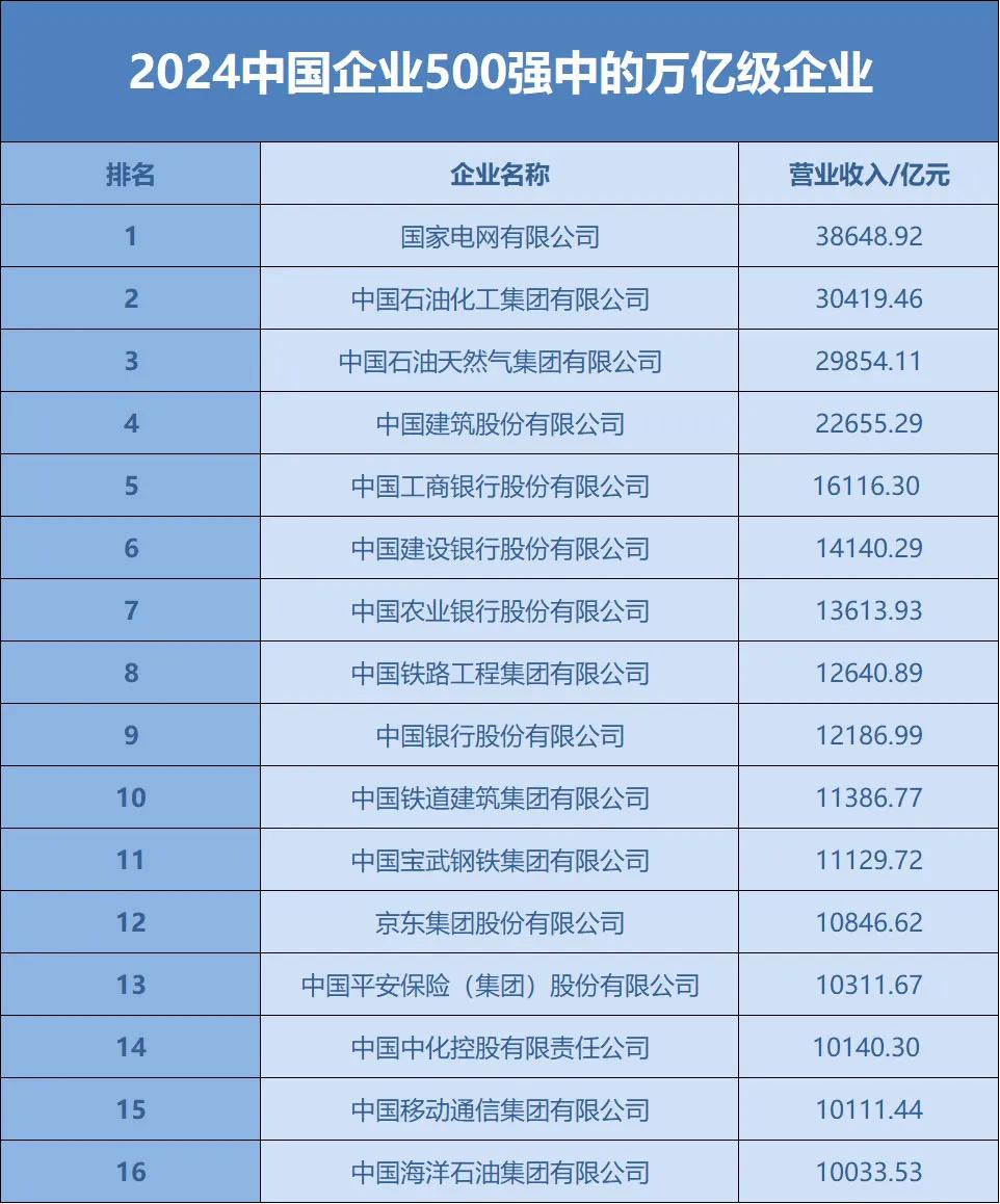 2024中國企業500強中,營業收入超過1000億元的企業數量為253家,占比超過50%;有16家企業營業收入超過了1萬億元。